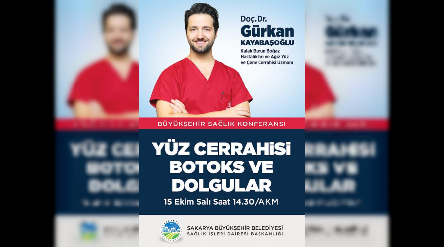 Sakarya Büyükşehir Belediyesi Sağlık İşleri Dairesi Başkanlığı tarafından düzenlenen sağlık konferansları devam ediyor. Bu kapsamda ?Yüz Cerrahisi Botoks ve Dolgular' konulu konferans katılımcılar ile buluşacak. 15 Ekim Salı günü AKM'de gerçekleştirilecek programa Doç. Dr. Gürkan Kayabaşoğlu konuşmacı olarak katılacak. Yapılan açıklamada, '15 Ekim Salı günü saat 14.30'da AKM'de gerçekleştirilecek ?Yüz Cerrahisi Botoks ve Dolgular' konulu konferansımıza tüm hemşerilerimiz davetlidir' ifadelerine yer verildi.